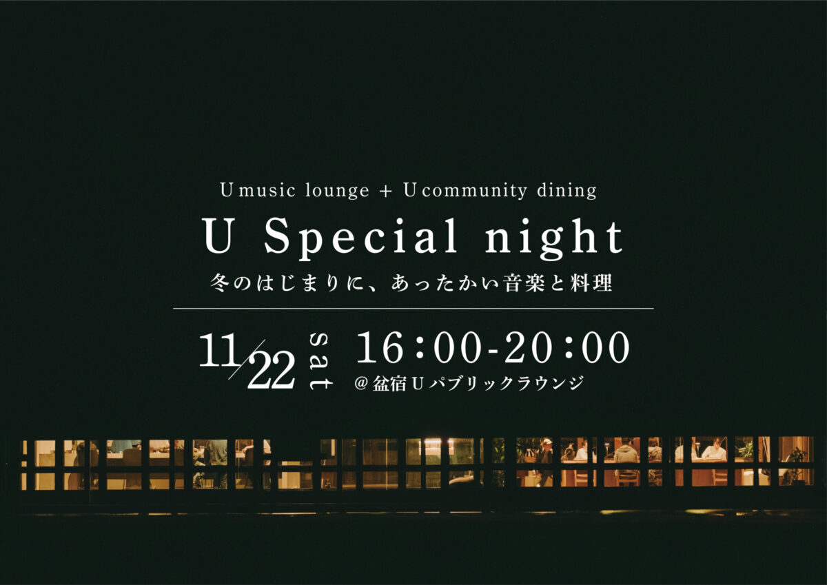 寒いからでしょうか。寂しさを感じては、あたたかさが恋しくなる今日この頃。今回で2回目となる「U Special night」は、毎月開催されているU music lounge と U community diningを同時開催。地元の方も地域外の方も、ご家族やご友人と一緒でも、もちろん一人でも、いつもよりスペシャルであたたかな夜をみんなで共有しましょう。心も身体もあたたかくしてくれる音楽と食をご用意してお待ちしております。