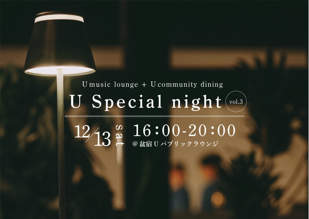 羽後町・西馬音内きっての大地主であった柴与家の一族が所有した築180年の商家を改修し2025年4月19日に開業した「盆宿U」。米蔵を改修したパブリックラウンジでは、常設のDJブースに広く活躍するDJをお呼びし、多彩な音楽と心地よい時間をお届けしていくU Music Loungeを定期開催しています。来る12月13日は、「U Special night」として、同じく毎月開催しているU community diningを同時開催。本プランは、当日提供する特別メニューのお得な事前予約プランとなります。