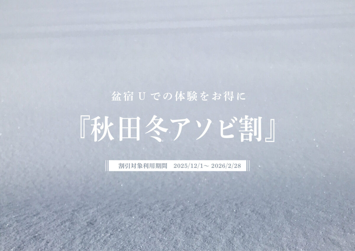 秋田県で実施される体験・アクティビティがお得に遊べる割引キャンペーン『秋田冬アソビ割』。盆宿Uで実施する各種体験も割引対象(平日50%/休日25%OFF)となります。盆宿Uでの体験がお得になるこの機会を、ぜひご活用ください。